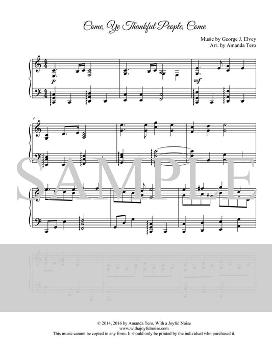 3 Thanksgiving Hymns Sheet Music for Intermediate Piano: Come, Ye Thankful People Come, We Gather Together, Now Thank We All Our God