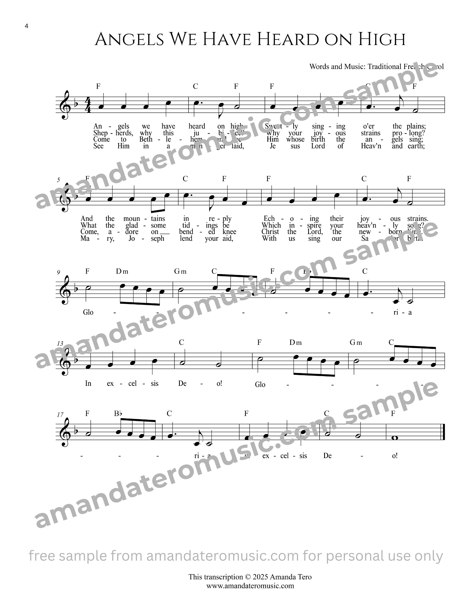 - Sample version (complete written out arrangement of the carol with left hand suggestions and single-note melody)