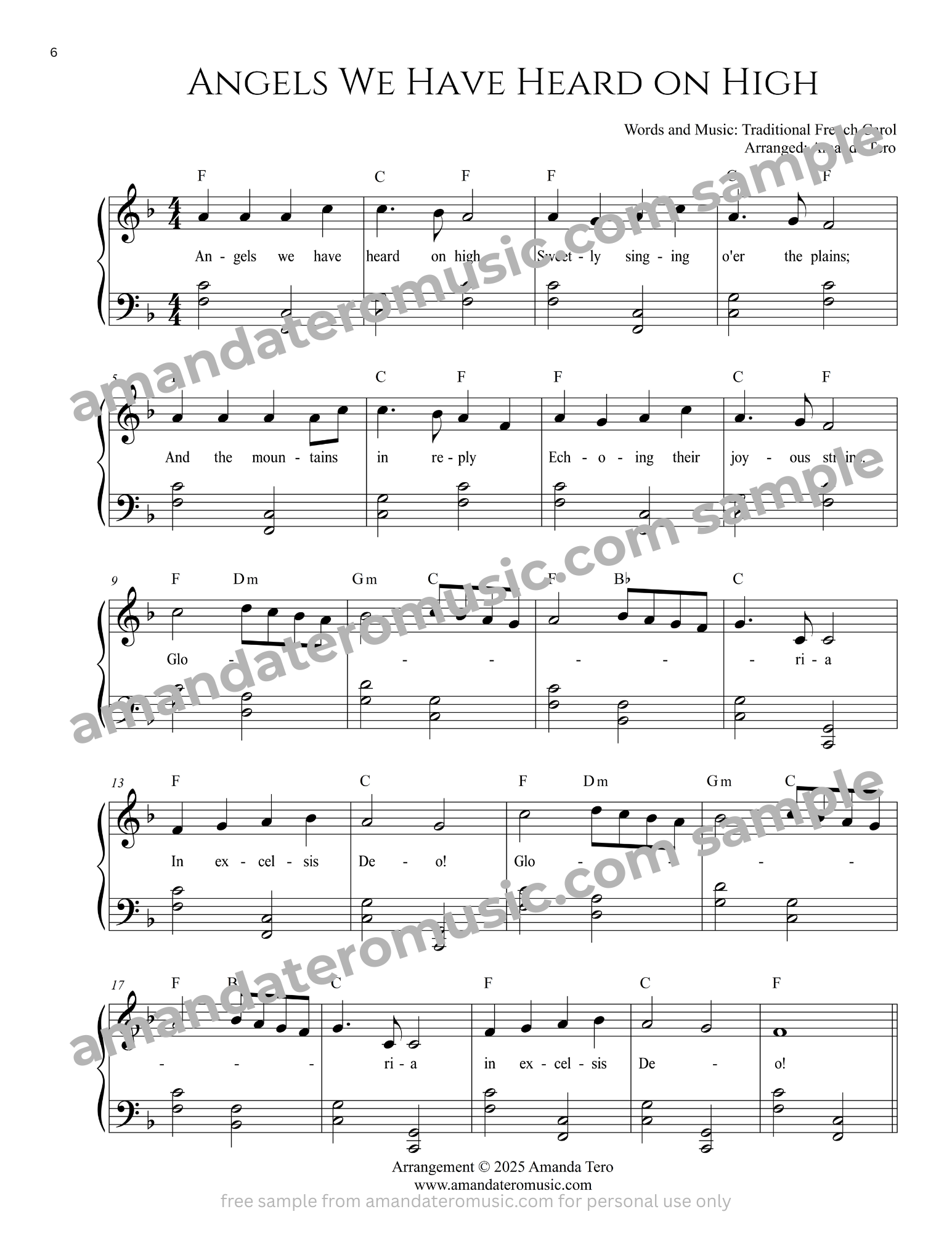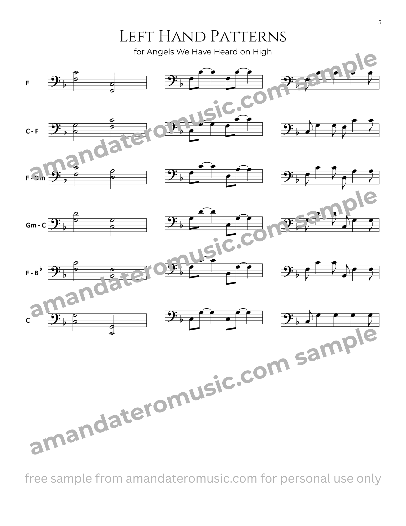 Each Christmas Carol with chords & LH patterns is a 2-page spread so you can easily go between the two. Feel free to mix and match the different LH patterns for the carol (e.g. use all of the same pattern for one verse, go between two or three patterns for one verse, etc.).
